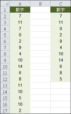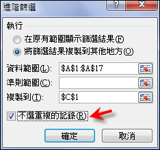 按下[確定]按鈕後,在C欄中就會顯示A欄中的不重覆資料。
