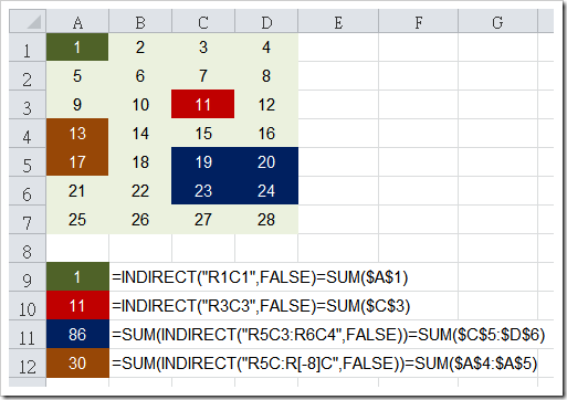 公式中使用INDIRECT函數中必須使用FALSE參數,才可使用R1C1表示法。