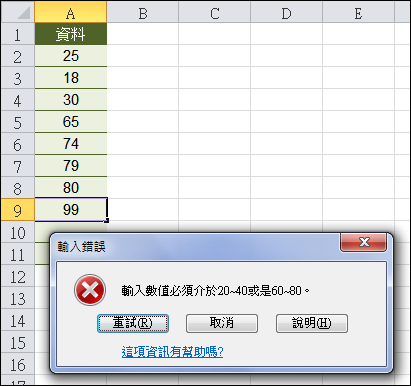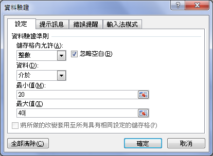 例如:要限制輸入資料必須介於20和40之間或是6080之間: