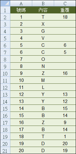 在Excel資料表中(如下圖),如果想要找出那一個內容重覆,該如何處理呢?例如:先建立一組流水號(公式中會用到),在內容的儲存格則顯示大寫英文字母,來檢驗與第幾個儲存格重覆。