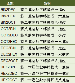 關於數字系統的轉換,參照以下常見的進制轉換函數對照表: