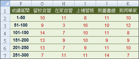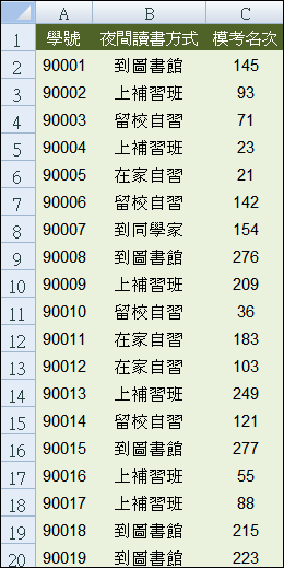 假設取得一個學生成績資料表(共300筆資料),其為學生夜間讀書方式和模擬考名次的記錄表(以下資料為模擬產生)。