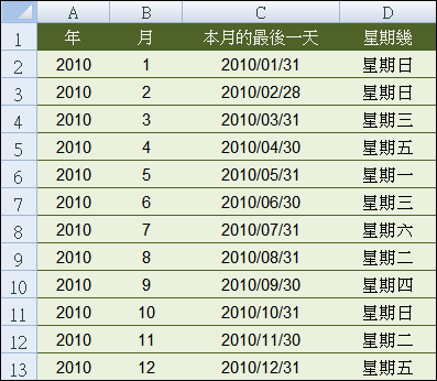 在Excel中如果想要知道每一個月的最後一天是那一天,又是星期幾,該如何做呢?
