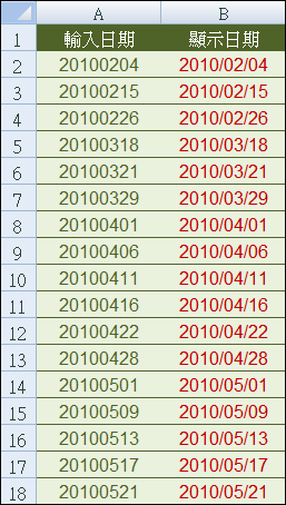 有時候接收到的文件中日期格式是沒有「/」或「-」這種分隔符號,例如「20100204」,但是這種資料放到Excel的工作表中,Excel只會把它當為數字來看。如果想要讓Excel認為它是日期格式,可能要做一些變化,例如:「2010/02/04」。