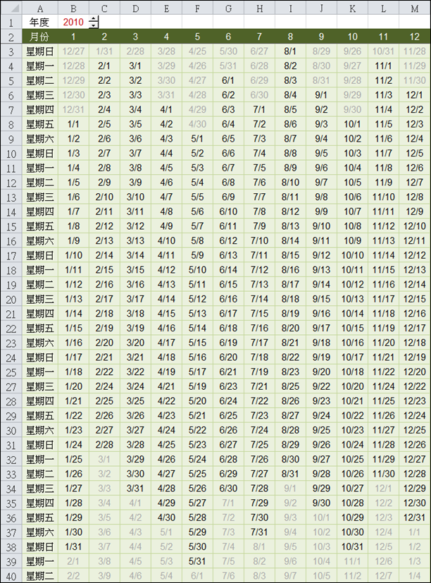 如果要使用Excel來建構一個全年各月依星期幾對照的萬年曆(如下圖),該如何設計呢?