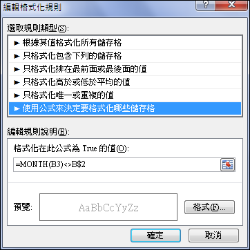 但是希望能將各欄中不屬於該月的日期淡化處理,利用格式化條件來做: