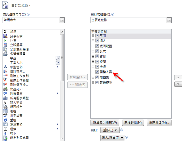 首先,在Excel選項中的[自訂功能區]中,勾選[開發人員]。