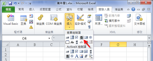 然後,在[開發人員]功能表下,選取[插入]下拉式清單,然後選取[微調按鈕]。