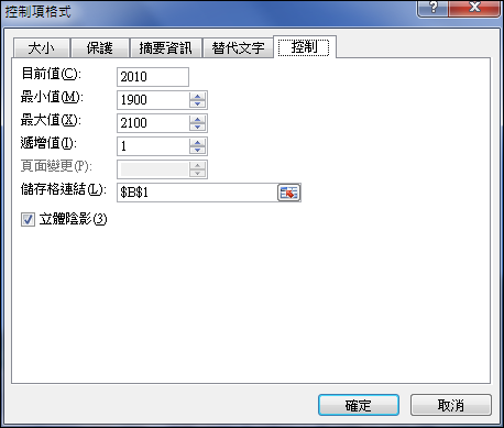在儲存格中拖曳出適當大小,並在[目前值]中輸入2010,[最小值]輸入1900,最大值輸入2100,遞增值輸入1,儲存格連結點選B1儲存格。意思是該微調按鈕可以調整的範圍為19002100,目前指在2010,調整結果為顯示在B1儲存格。