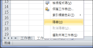 如果要隱藏工作表,則在工作表名稱上按一下右鍵,選取[隱藏]。