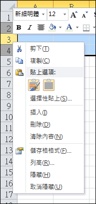 如果想要隱藏欄/列時,先選取要隱藏的欄/列,在欄名/列號上按一下右鍵,選取[隱藏]。