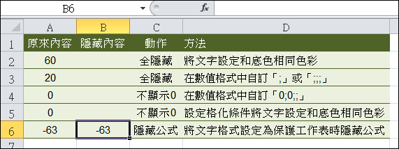 如果想要隱藏儲存格中的內容,可以有下列幾種方法:
