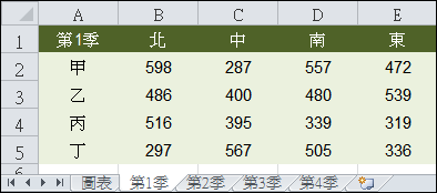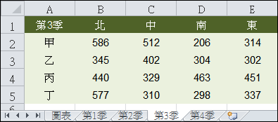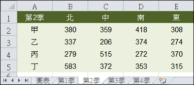 首先,將第1季至第4季的工作表如上圖建置好,其中四個工作表的結構是一樣的。