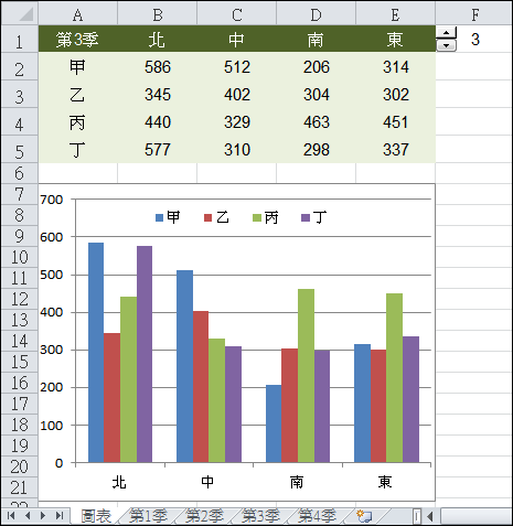 選取儲存格A1:E5,建立一個直條圖。當使用微調按鈕時,工作表中的資料內容會隨之對應各季的內容,而圖表會動態同步顯示各季資料所呈現的直條圖。