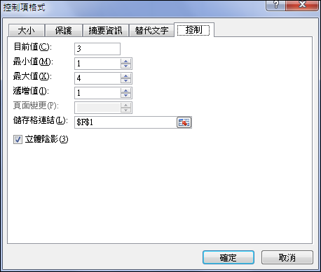 再來,建立一個微調按鈕,最小值為1,最大值為4,儲存格連結為$F$1。