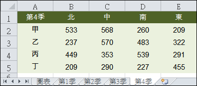 在Excel中分別於不同的工作表中放置各季於四個區域中的四個人的業績,該如何在一個圖表中動態顯示呢?