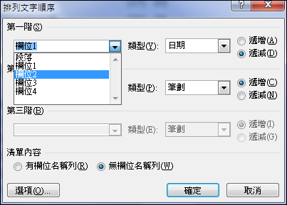 3. 在第一階的下拉式清單中,選取一個要做為排序依據的欄位(或是段落)。