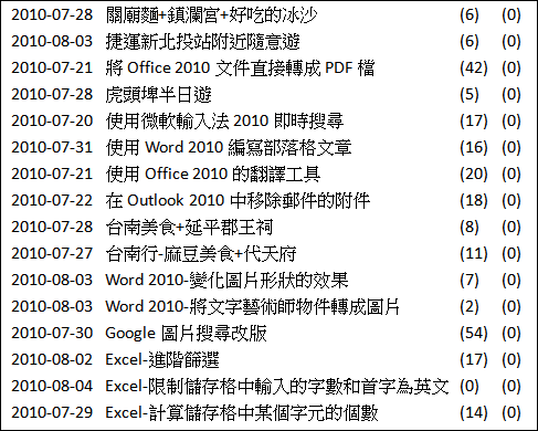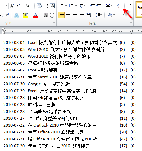 當在 Word 2010 中,由其他地方貼上了一些資料(如下圖),可以使用「排序」功能,來重排這些資料。此例中雖然沒有使用表格,但是使用Tab鍵來替代。
