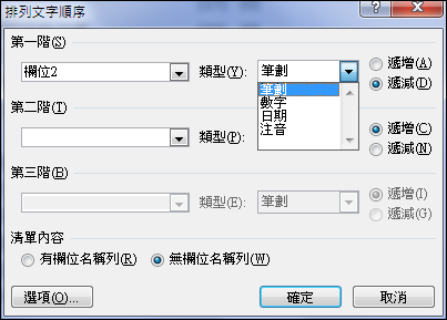 4. 根據這個欄位,再選取要排序的類型,例如「筆畫、數字、日期、注音」,並選取遞增或遞減。