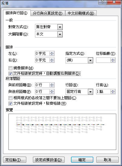 3. 在[縮排與行距]標籤下,設定[行距]為「固定行高」,而[行高]設定為「1點」。
