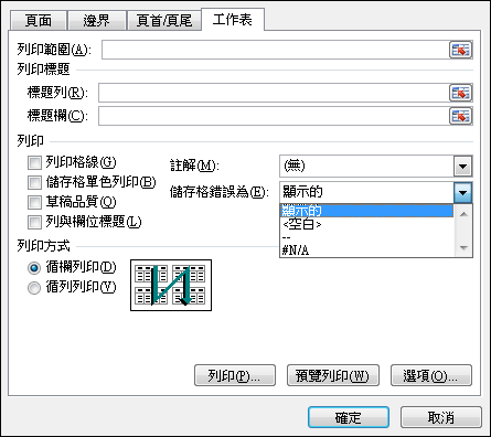 2. 在[儲存格錯誤為]中選取顯示的、空白、—或是#N/A等。(本例選取[空白])