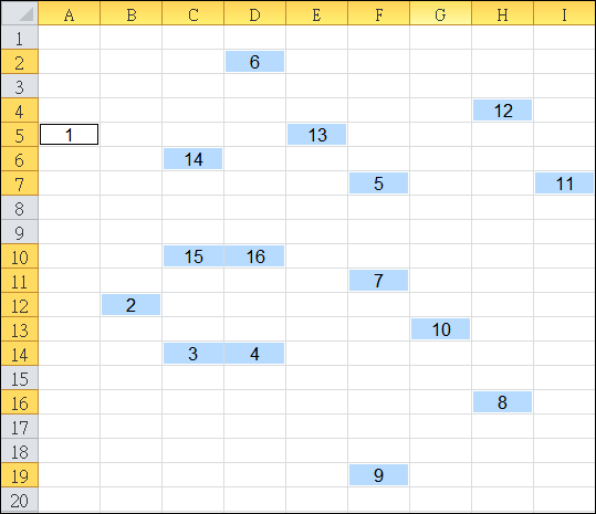 如果你在 Excel 工作表中的分散儲存格裡輸入資料時(如下圖,其中的數字標示輸入順序),希望每次都依照某個順序來輸入,該如何處理呢?