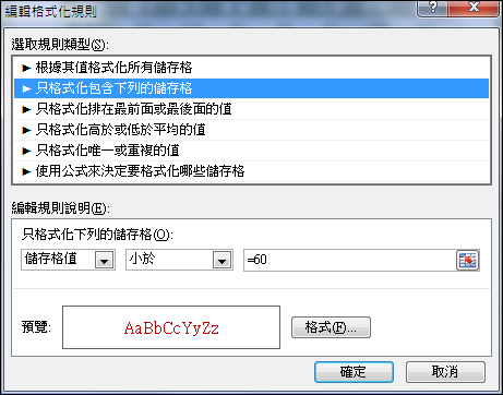 如果想要將不及格者(<60)以紅色標示,該如何處理?