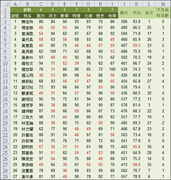 K欄的平均是指加權平均,也就是要將每個科目乘以節數後相加,再除以總節數。