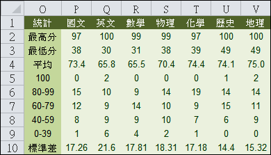 儲存格P7:{=COUNT(IF(C3:C38>=60,IF(C3:C38<=79,C3:C38)))} [陣列公式]