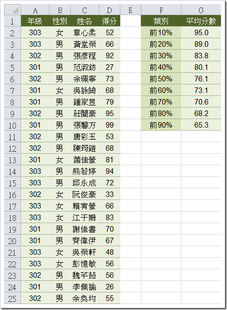 如果你在 Excel 中取得一個成績的資料表,而想要計算某百分比內的平均分數,該如何處理?