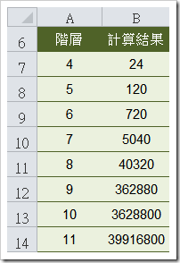 儲存格B7:{=PRODUCT(ROW($A$1:INDIRECT("A"&A7)))}