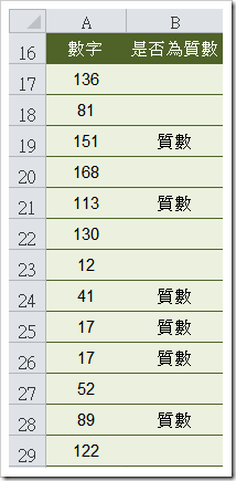 {=IF(PRODUCT(MOD(A17,ROW($A$2:INDIRECT("A"&INT(A17^0.5)))))<>0,"質數","")}