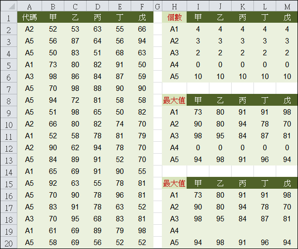 在 Excel 中取得一個資料表,若要摘要該資料表的各種代碼之個數和最大值該如何處理?