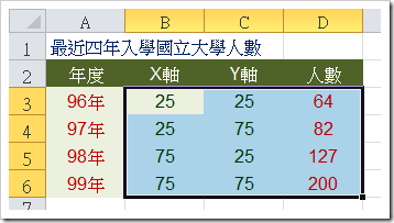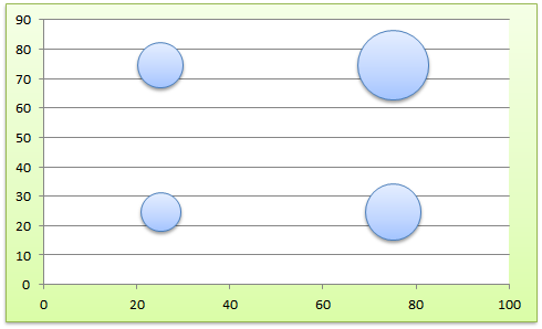 1. 先將這個圖表加入一些資訊(如下圖),其X軸和Y軸中的資料是要標定這四個泡泡的位置(分別是左下、左上、右下、右上,你可以自行調整位置)。