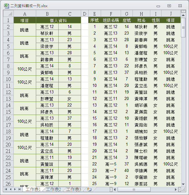 其問到如果要反過來做,要將二列資料轉成一列時(參考下圖,左資料表轉換成右資料表),該如何處理?