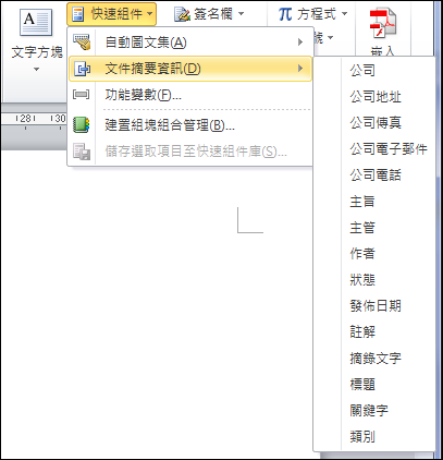 如果想要在文件中使用摘要資訊中的內容該如何處理呢?你可以使用[插入/快速組件]選項,然後再選取「文件摘要資訊」的項目,即可以將摘要資訊內容插入文件中。