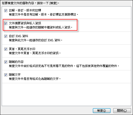 選取「文件摘要資訊與私人資訊」項目,按一下[檢查]按鈕。