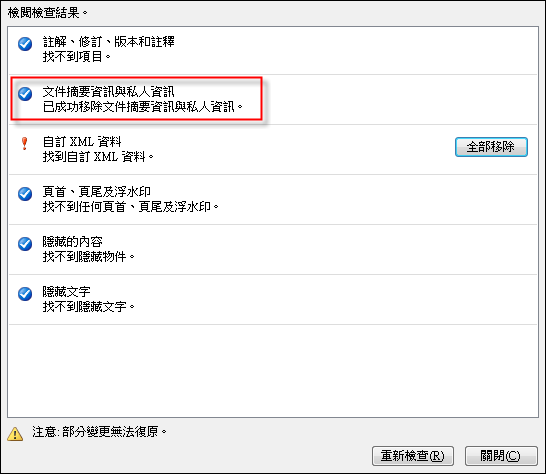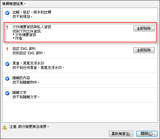 經過檢查後,顯示有相關的文件摘要資訊與私人資訊,按一下[全部移除]按鈕。