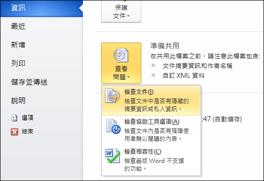選取[檔案/資訊]選項,在[查看問題]中選取[檢查文件]選項: