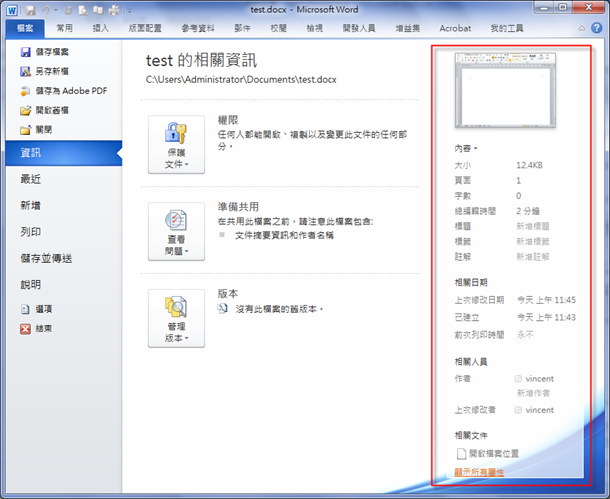 當你在 Word 中選取[檔案/資訊]時,在視窗最右側會顯示該檔案的摘要資訊。按一下最下方的「顯示所有屬性」,可以顯示完整的內容。