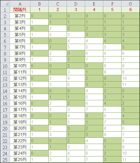 在 Excel 中如果想要有規律的改變間隔列的底色(參考下圖)該如何處理呢?假設第1列的數字做為標記間隔列數,並依先深色間隔白色的規律。