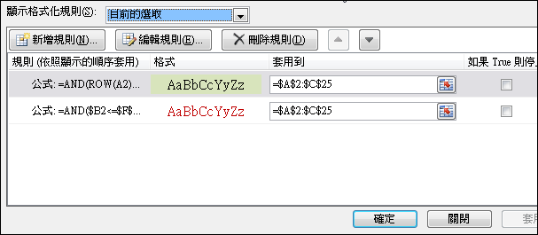 接著要將儲存格依選取的日期標示出不同格式的範圍。選取儲存格A2:A25,輸入以下設定公式: