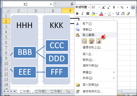 (2) 複製 SmartArt 物件,在工作表上任意位置按一下右鍵,選取[貼上圖片]選項。