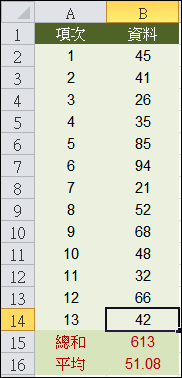 儲存格B15:=AVERAGE(B2:B13) 修正為儲存格B16: =AVERAGE(B2:B14)
