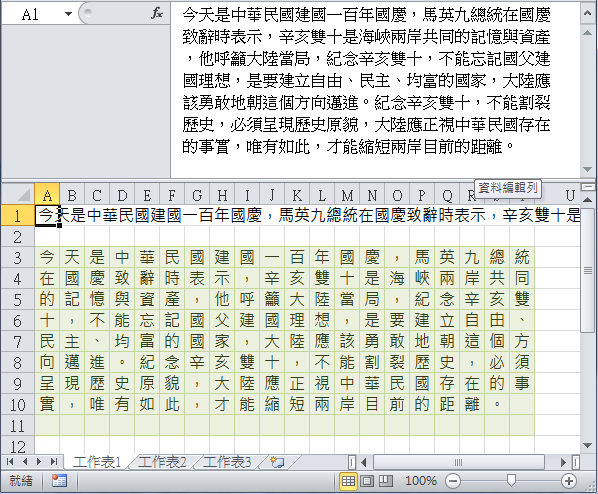 儲存格A3:=MID($A$1,(ROW(1:1)-1)*20+COLUMN(A:A),1)