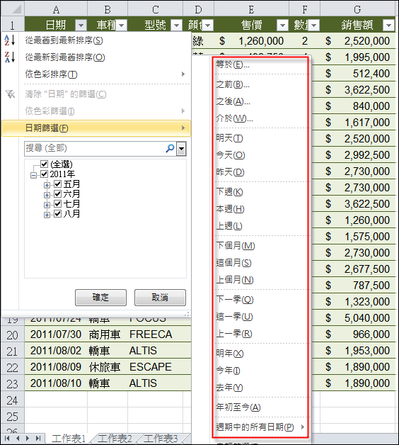 如果你要篩選「日期」欄位,可以使用多種和日期相關的篩選條件。