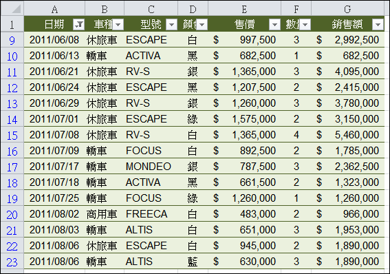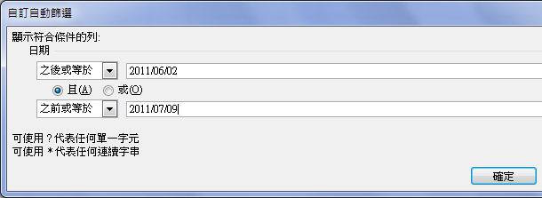 例如:篩選介於2011/06/02 到 2011/07/09 之間的日期: