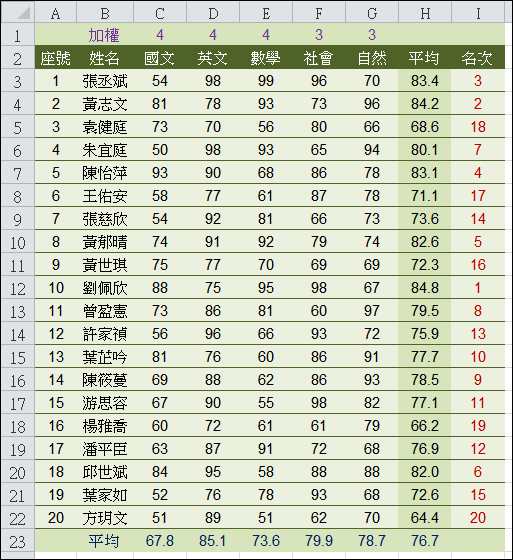 在 Excel 中取得一個學生考試成績表(如下圖),其中每個人的平均分數是一個加權平均。