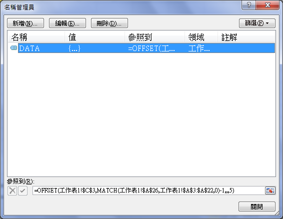 5. 在資料編輯列中,將「工作表1!C3:G3」改成「DATA」。