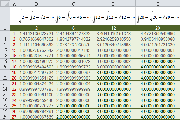 同樣原理套用在當代入 6, 12, 20 時,也可以得到整數結果(分別為 2, 3, 4 )。